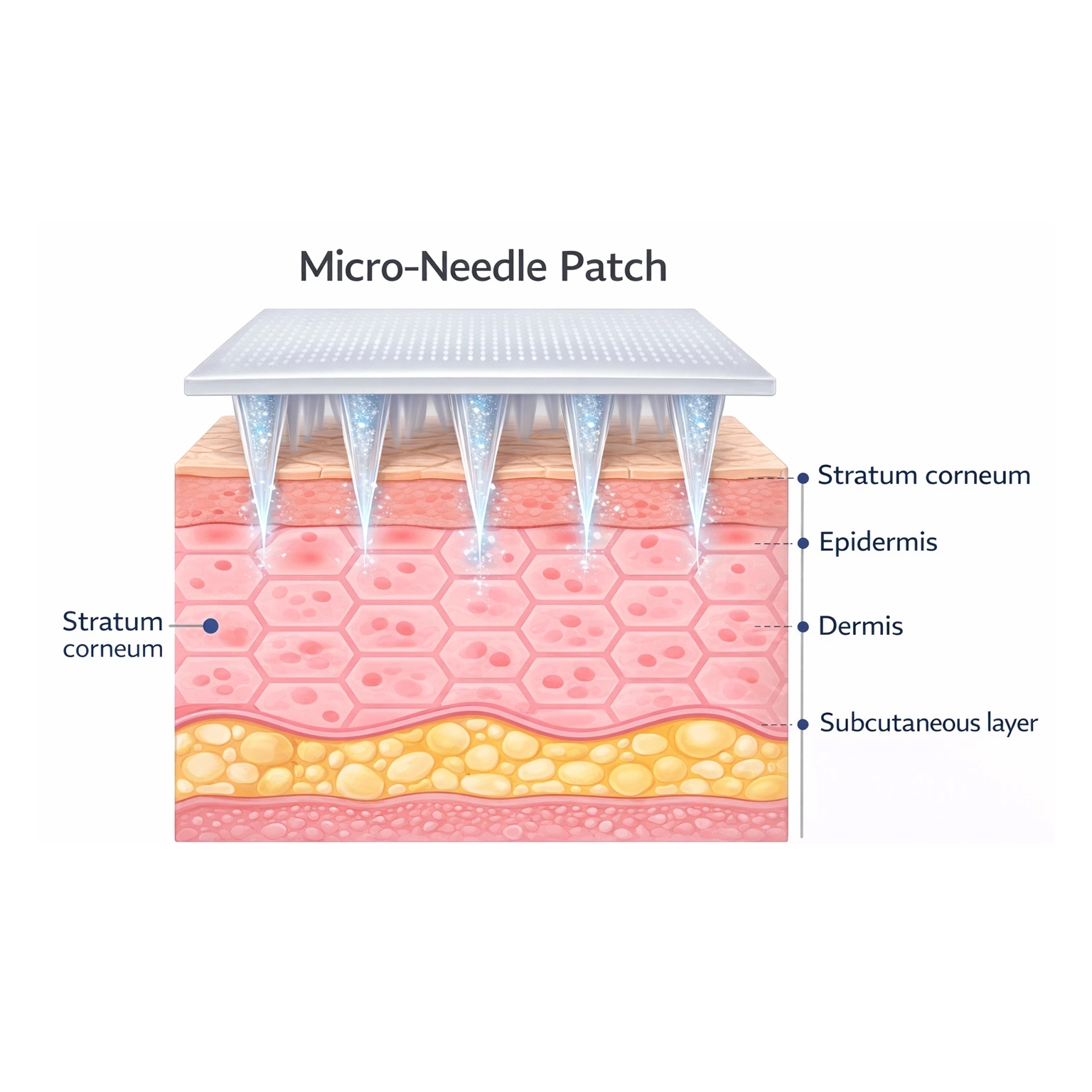 When applied to the skin, the microneedles painlessly penetrate the epidermis and dissolve in place.